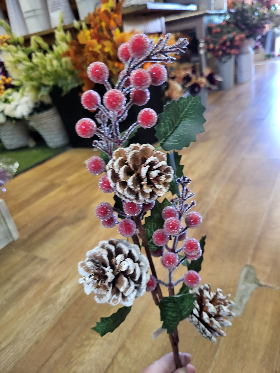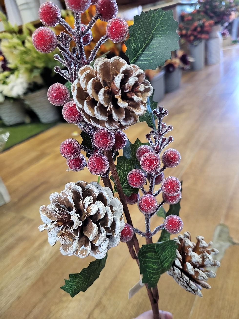 Long stem glistening berries and snowy pinecone spray