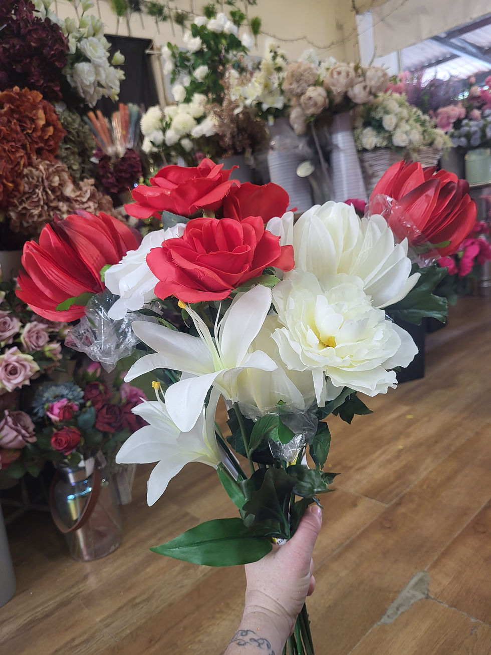 Bundle of 10 Long stem red and white flowers - 5 lily/5 carnation